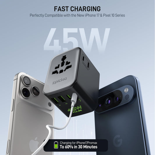 EPICKA Pulse 45W European Travel Adapter – Universal Power Adapter with 5 Ports (1 AC, 2 USB-A, 2 USB-C) PD Fast Charger for EU & Japan