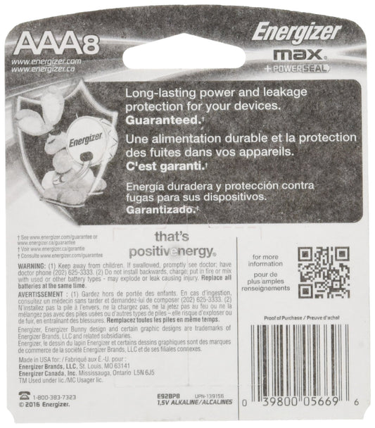 Eveready Energizer Max Alkaline AAA Batteries 8 ea, Silver (E92MP-8)
