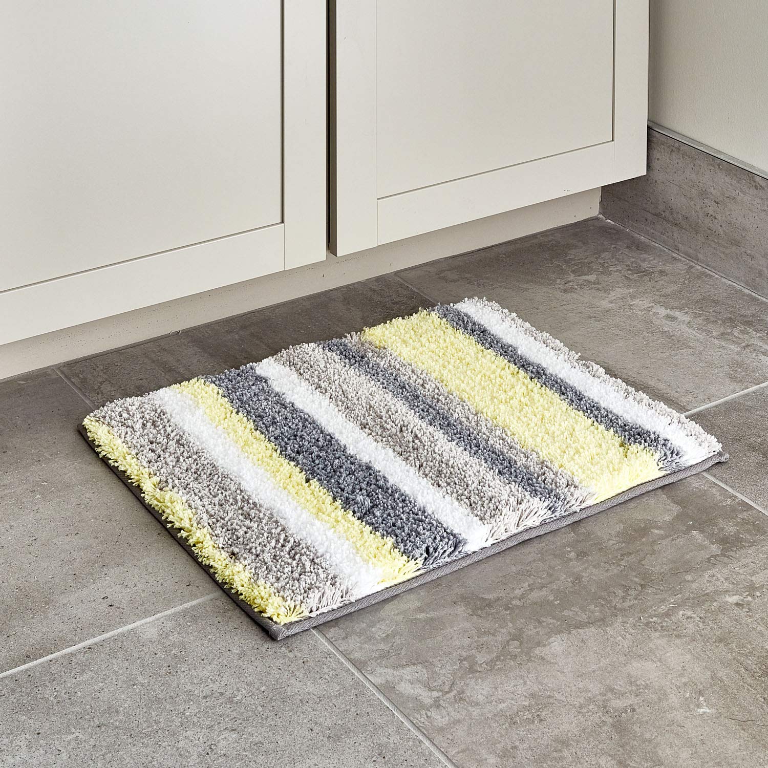 - iDesign Stripz Microfiber Polyester Bath Mat, Non-Slip Shower Accent Rug for Master, Guest, and Kids' Bathroom, Entryway, 21" x 17", Gray and Yellow