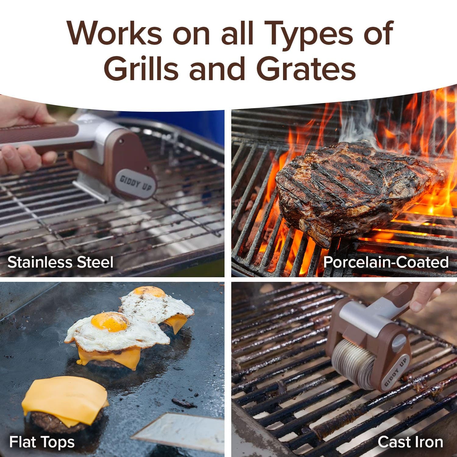- NO BRISTLES, NO MESS: Ditch dangerous wire brushes. Giddy Up uses a solid stainless steel roller to power through char without shedding bristles that can end up in food