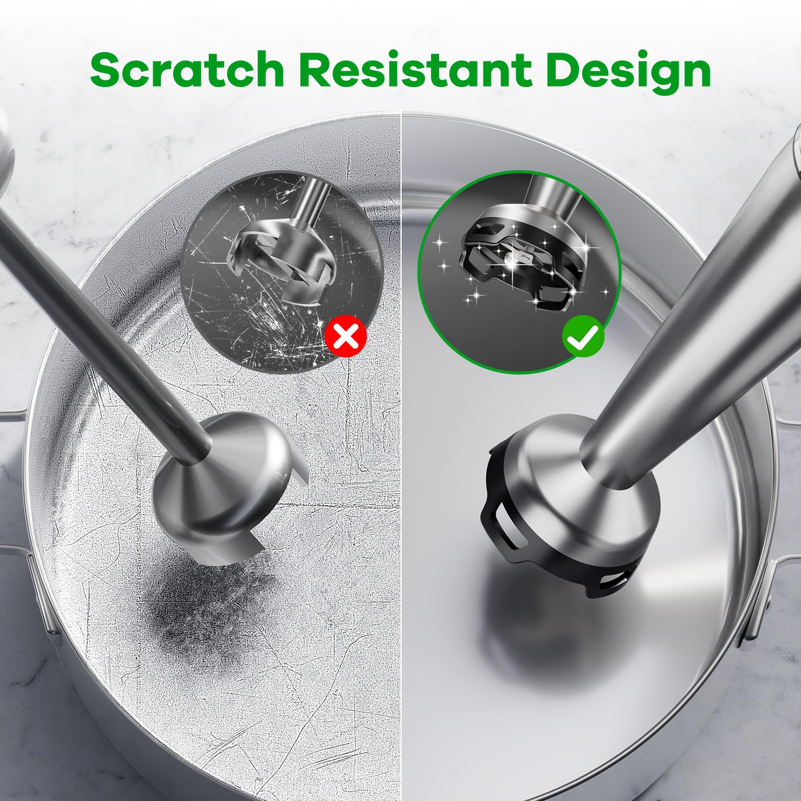 - Effortless Clean-Up, Scratch-Free: Features a unique food-grade nylon blade guard designed to minimize suction, preventing scratches on your pots and pans and keeping splashes at bay for a cleaner kitchen and hassle-free clean-up.