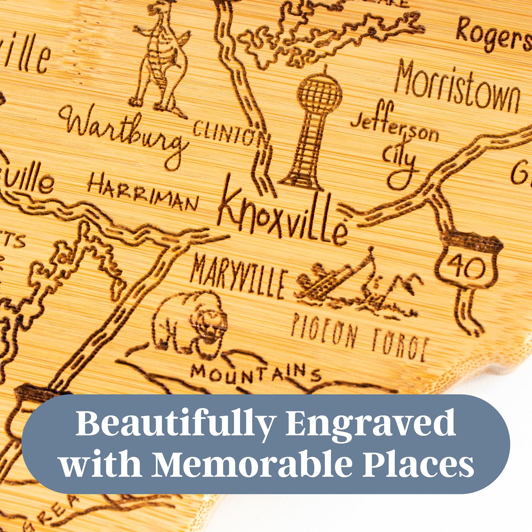 • Celebrate The Volunteer State - Show your Tennessee pride with this beautifully crafted state-shaped cutting board featuring detailed laser-engraved map artwork of cities, towns, landmarks and beloved sights