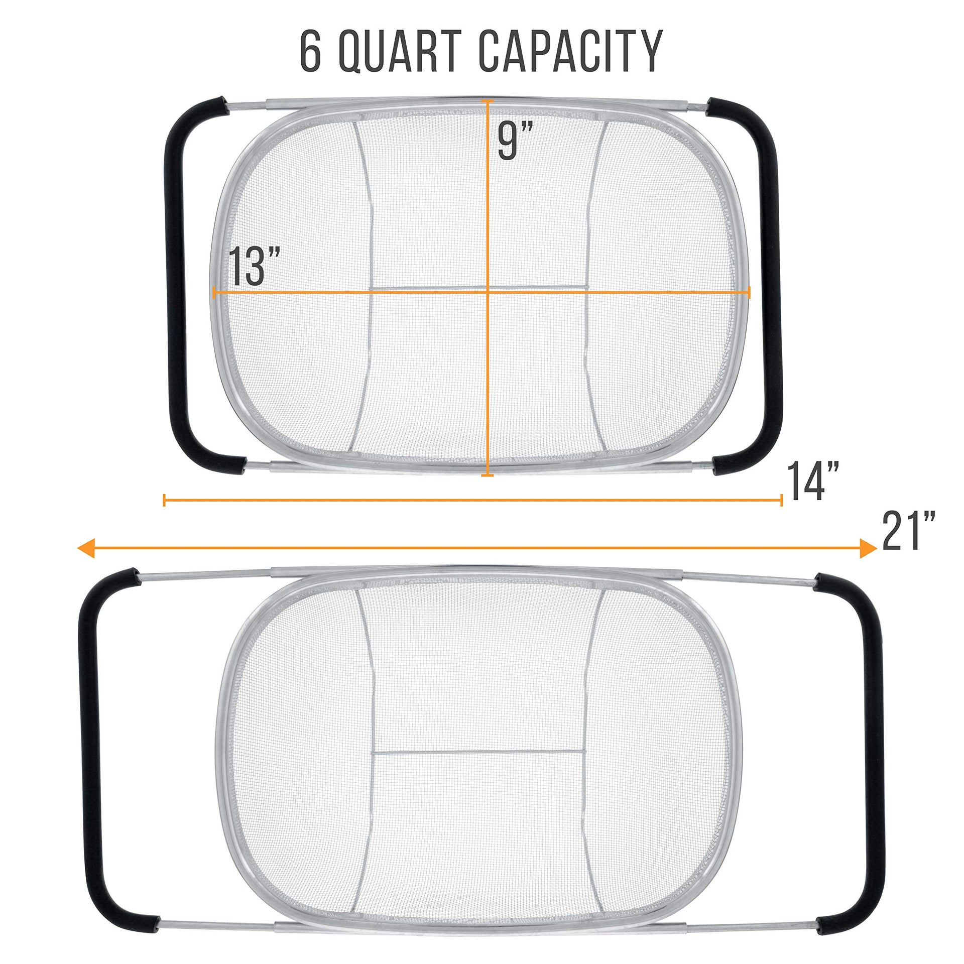 - Sift, Strain, Drain And Rinse: Colander has a very large 13" by 9" basket with a 6 quart capacity, and this is the ideal size needed to handle most straining, draining, rinsing, sieving, sifting and filtering tasks. The baskets concave mesh net easily catches and sifts, strains or drains small ingredients. The resting legs also allow it to be set on a counter top and be used as a basket to hold or display fruits and vegetables.