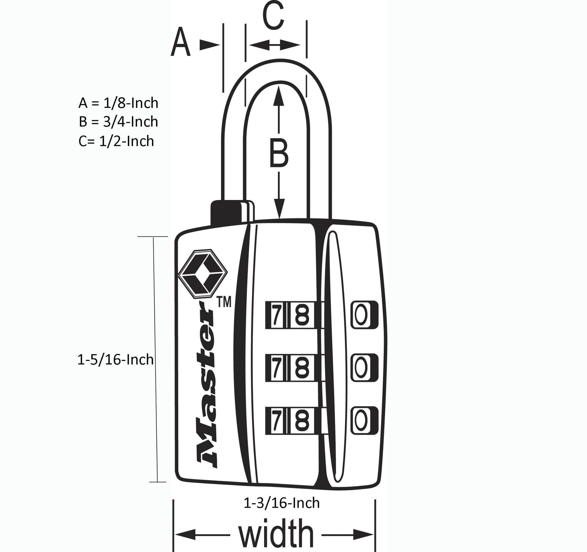 - 1-3/16 in. (30 mm) wide lock body; 1/8 in. (3 mm) diameter shackle with 3/4 in. (19 mm) length, 1/2 in. (13 mm) width