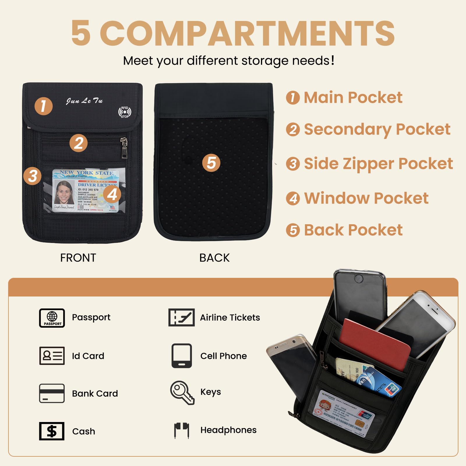 - Multi-pocket and Adjustable Shoulder Strap - This waterproof travel passport wallet has 5 pockets. The main pocket can store valuable documents, the secondary pocket can store coins, etc., the side zipper pocket can store money, the visual window pocket can store other documents for easy access, and the back pocket can store mobile phones, etc., which is convenient take