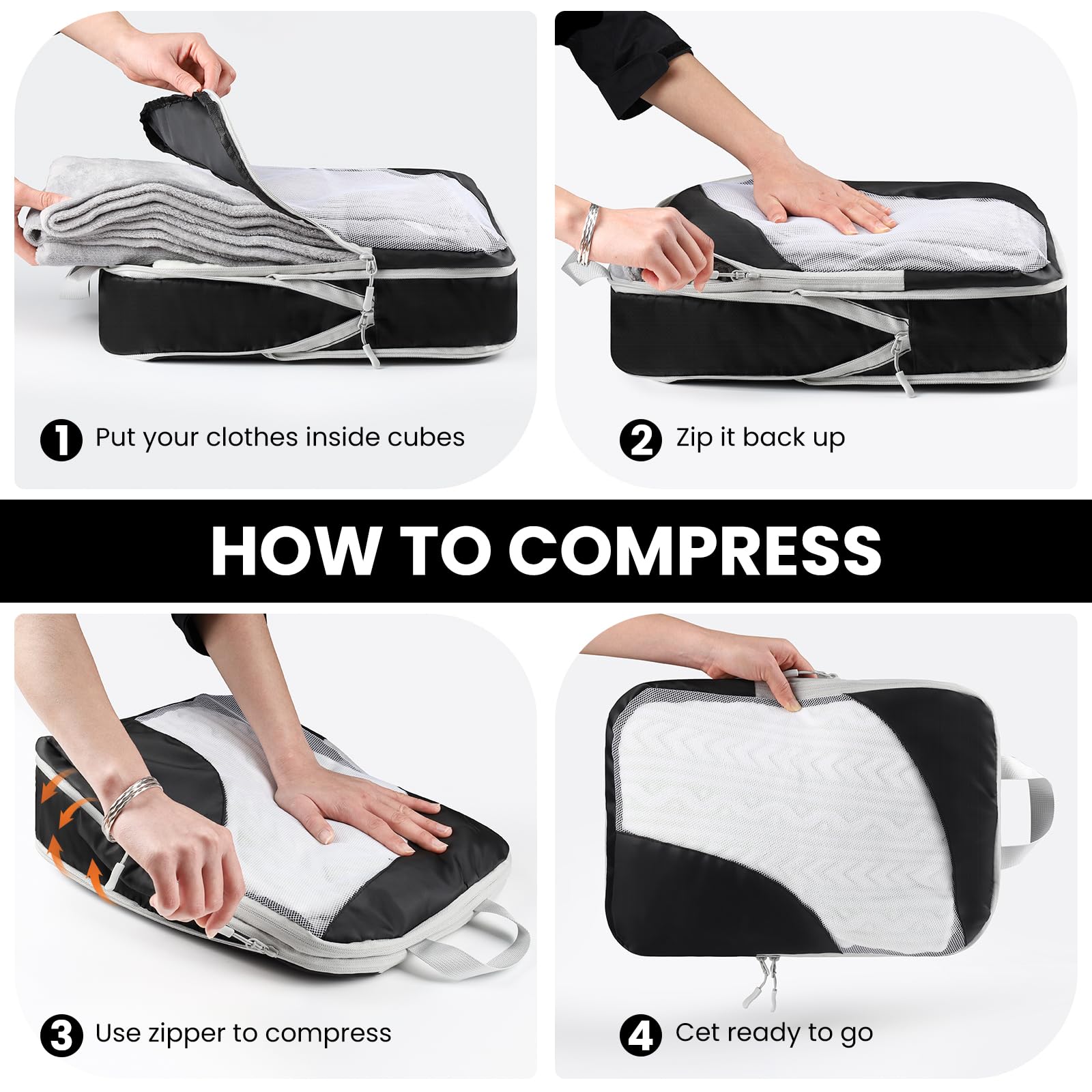 - How to Compress: 10 set compression packaging cube is compressed by the middle zipper.Using steps 1: Fold and flatten clothes steps. 2: Pack clothes in the cube and zip the front zipper. steps 3: put a finger on the back of the middle zipper when compressing to avoid zipper get stuck in fabric