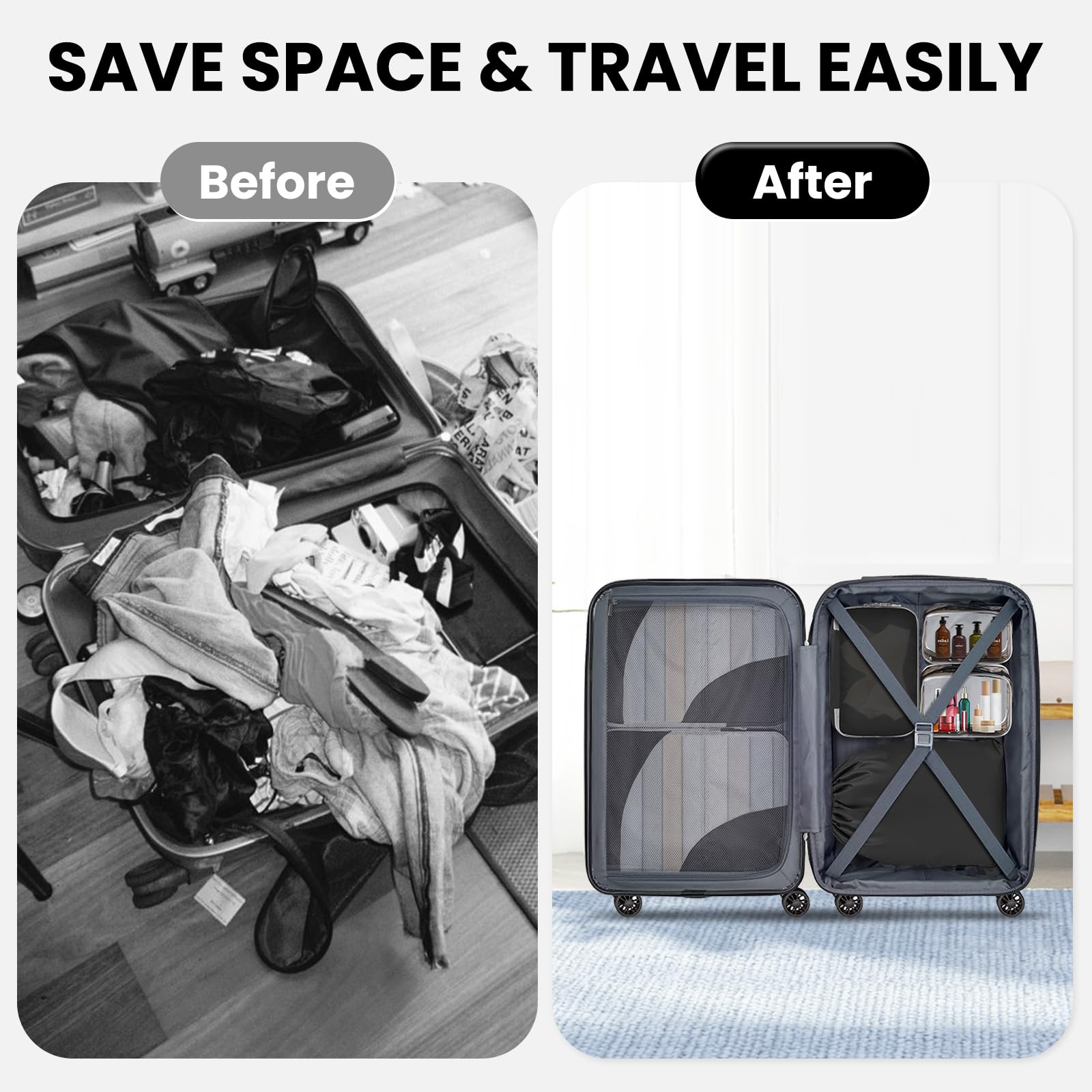 - SAVE 60% OF SPACE: With our compression travel bags, you can easily compress your clothes and other essentials into a compact shape, freeing up to 60% of space in your luggage. Imagine being able to fit twice as much stuff in your suitcase without compromising on style or comfort. Premium sturdy and smooth double way zipper with extended cord ensure fast and easy opening and closing of the packing cubes