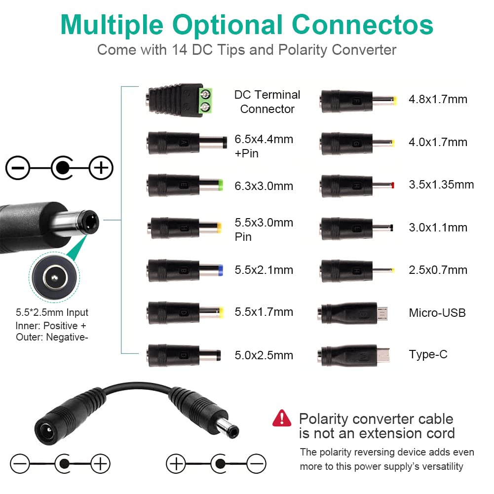 • Package Includes: 1 x 3~24V 5A universal ac/dc adapter, 14 x DC tips, 1x reverse polarity converter. If you have any questions, please feel free to contact us via Amazon, and we are here for you