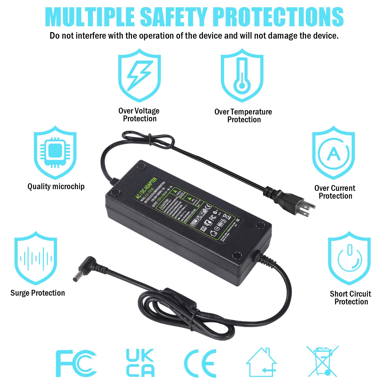 • It is perfect for 5050 3528 LED Light, Wireless Router, ADSL Cats, Security Cameras, Audio/ Video Power Supply, 3D Printer, LED Driver, CCTV Security System, LCD Monitor, Webcam Router and other 12V devices.Works with all devices that draw less than 10A