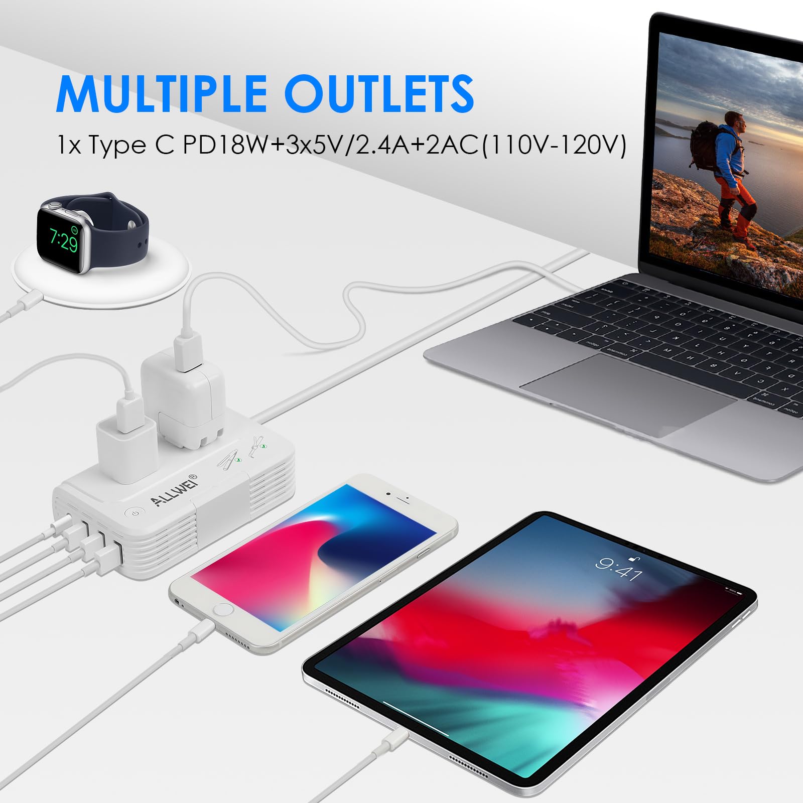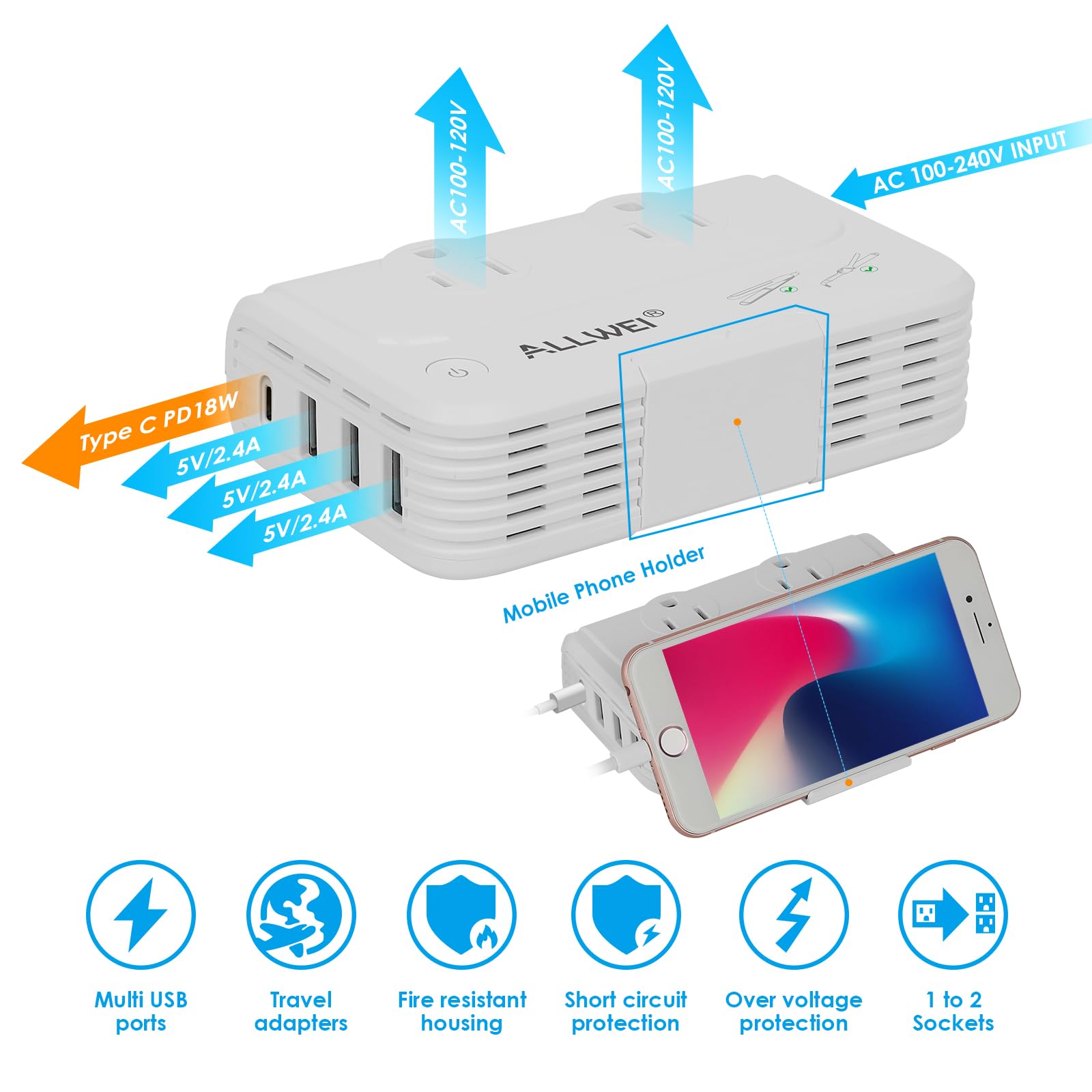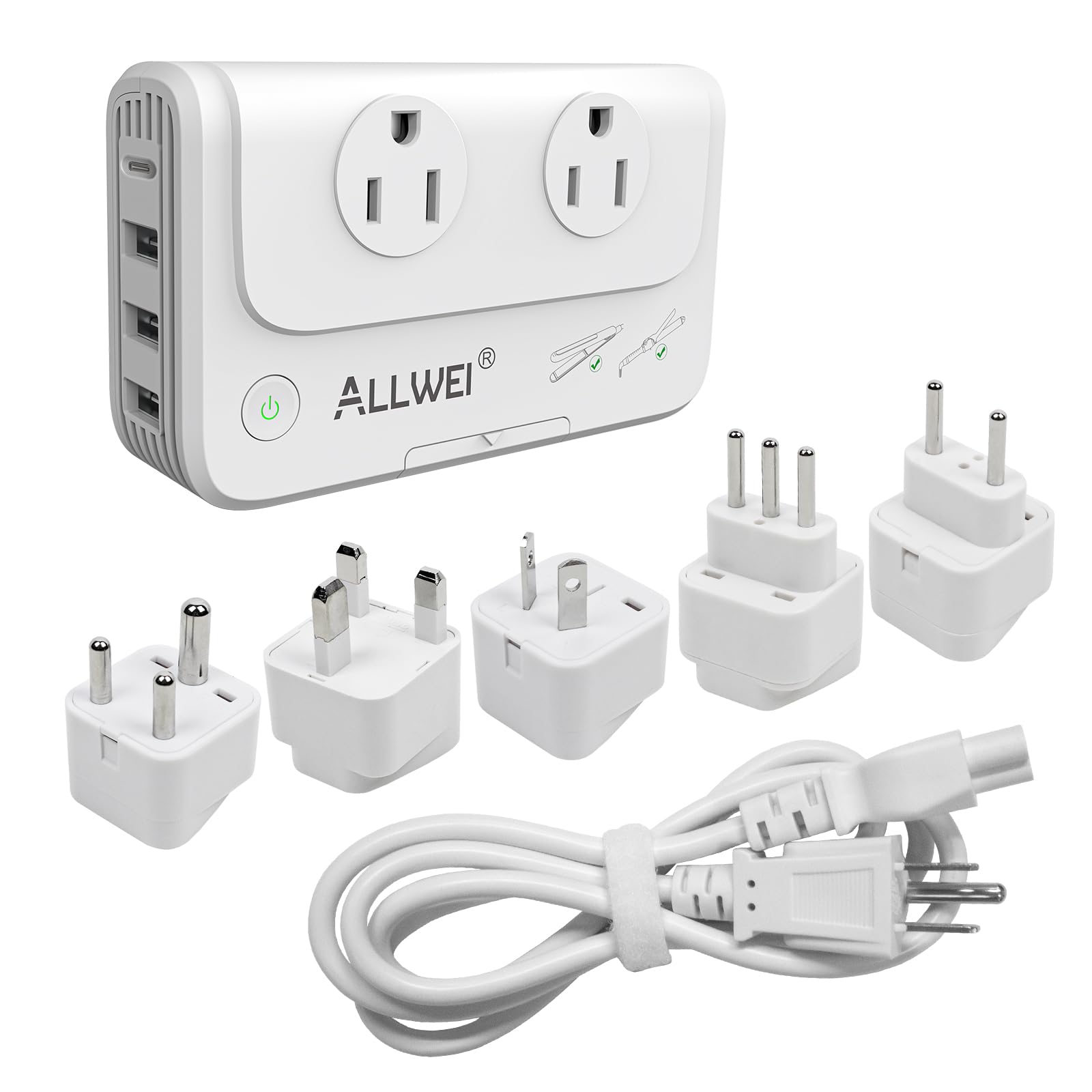 Portable Power Converter This upgraded version WORKS PERFECTLY for Hair Straightener and Hair Curling Iron,the International Travel Adapter with two standard US plugs and Include 4 USB ports charging one Type C PD18W,it can use with appliances under 230 Watt such as Electrical shaver/hair cutter, Electrical toothbrush, fan, nebulizer, game console, Kindle,Laptop, Mobile phones, etc.. Maximum wattage: 230w When simultaneously charging multiple devices, make sure the total wattage is less than 230w in case of over-heating or damage. Please don’t use this converter with appliances rated at voltage 220V-240V AC. This product is only able to supply power to 100V-120VAC products. MultiProtect Safety System ALLWEI power converter with the built-in protection,Surge protection, short circuit protection and more advanced safety features keep you and your devices safe. Portable Size Small size(4.9X2.9X1.2 inches)as passport for you easy to take the kit with you on the go. Five Types of Adapters: Type E/F (EU PLUG): France / Germany / Belgium / Poland / Russia / Slovakia / Czech Republic / Andorra / Armenia / Austria / Belarus / Bulgaria / Croatia / Estonia Type D (IN Adapter): India, Dominica, Ghana, Iraq, Lebanon, Pakistan, Tanzania, Zimbabwe Type L (IT Adapter): mainly used in Chile /Ethiopia /Italy /Lybia / Syria / Tunisia /Uruguay Type I (AU Adapter): mainly used in Australia, New Zealand, China and Argentina Type G (UK Adapter): mainly used in Bahrain /Belize /Botswana /Brunei /Cyprus /Dominica /England /Ghana /Gibraltar /Grenada /Hong Kong /Iraq / Ireland / Kenya / Macau /Malta /Malaysia / Nigeria /Nothern Ireland /Oman /Qatar /Saint Lucia /Saint Vincent /Saudi Arabia /Scotland /Singapore /Sri Lanka /Tanzania /Uganda/ the United Arab Emirates /Wales /Yemen /Zimbabwe