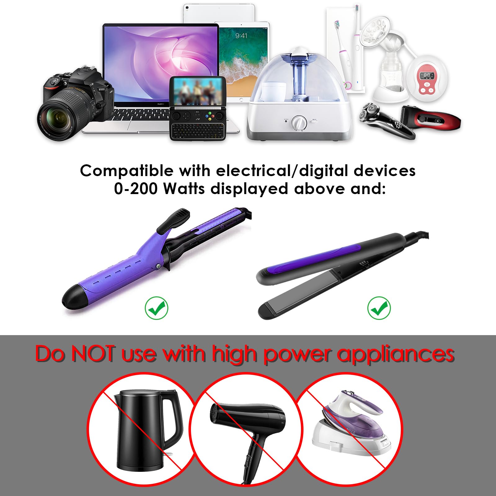 • ✈【Patented product with Patent number: US10270355B1, Perfect for hair straighteners and curling irons within 200W】 Patented technology allows you to use curling irons and hair straighteners up to 200W in 220V countries. The international travel adapter works with appliances up to 200W such as electric shaver/barber, electric toothbrush, fan, sprayer, game console, Kindle, laptop, mobile phone, etc.