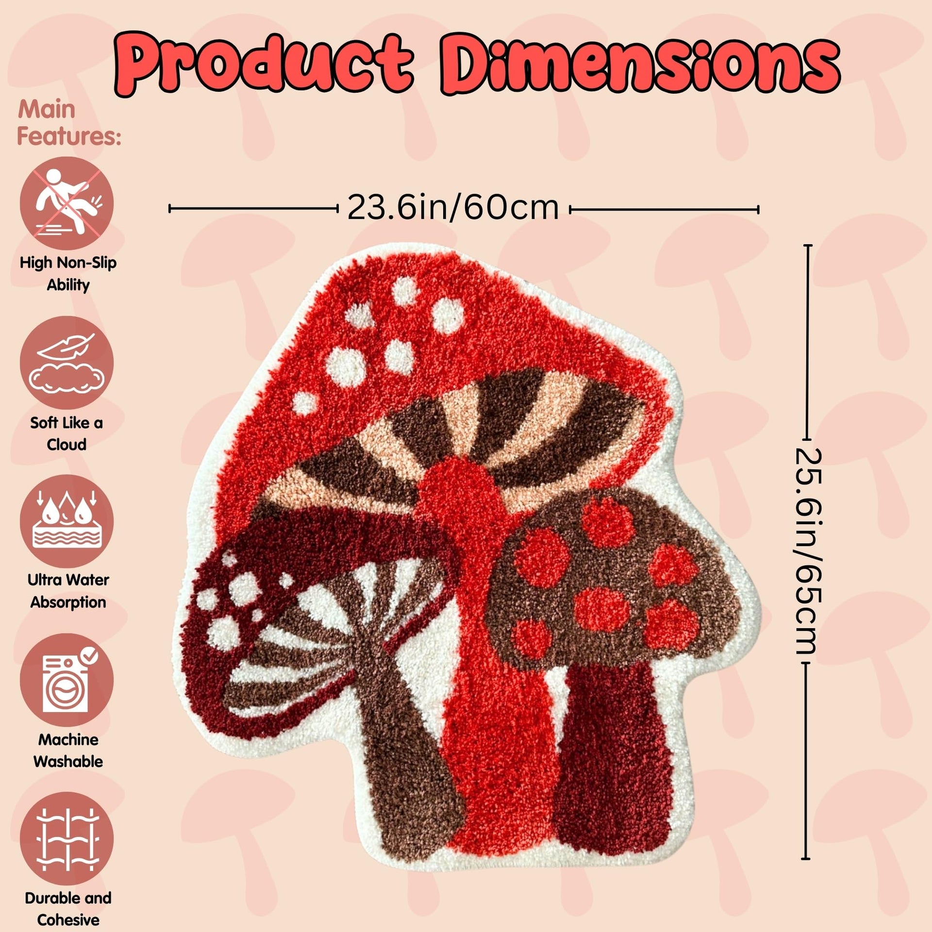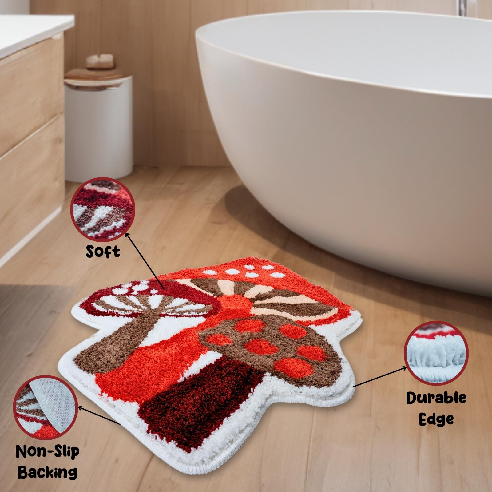 BeauWoven Mushroom Rug - Washable Bath Mat Non-Slip Bathroom Rug Absorbent Mat for Kids and Women Ideal Red Mushroom Decor Rugs for Bedroom, Kitchen