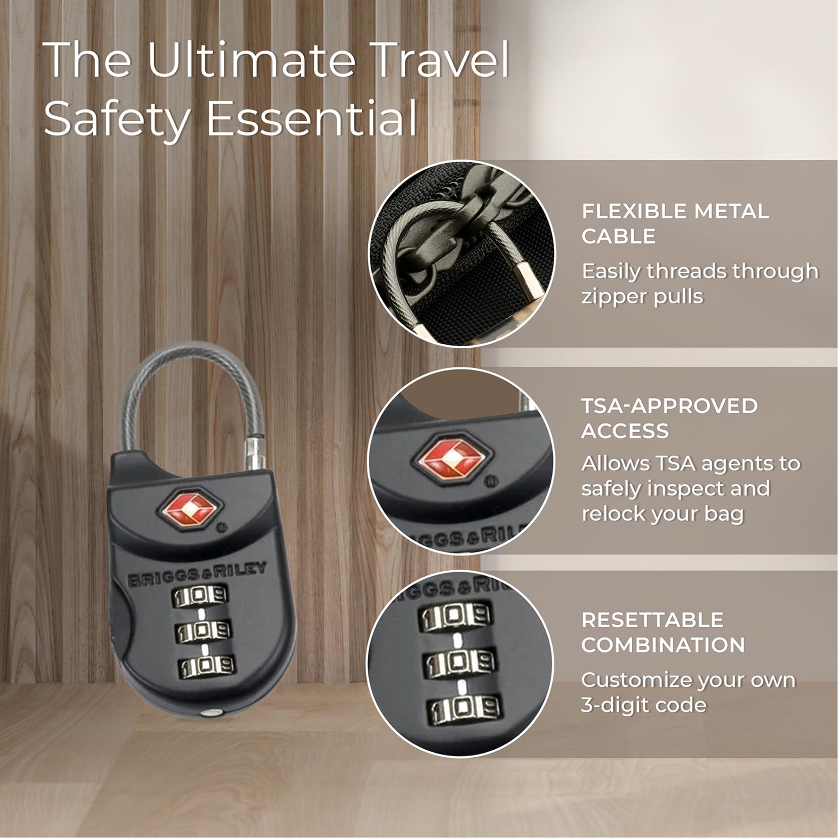 Briggs & Riley TSA Approved Cable Lock – 3-Digit Combination Travel Lock with Flexible Cable for Luggage, Suitcases & Zippered Bags