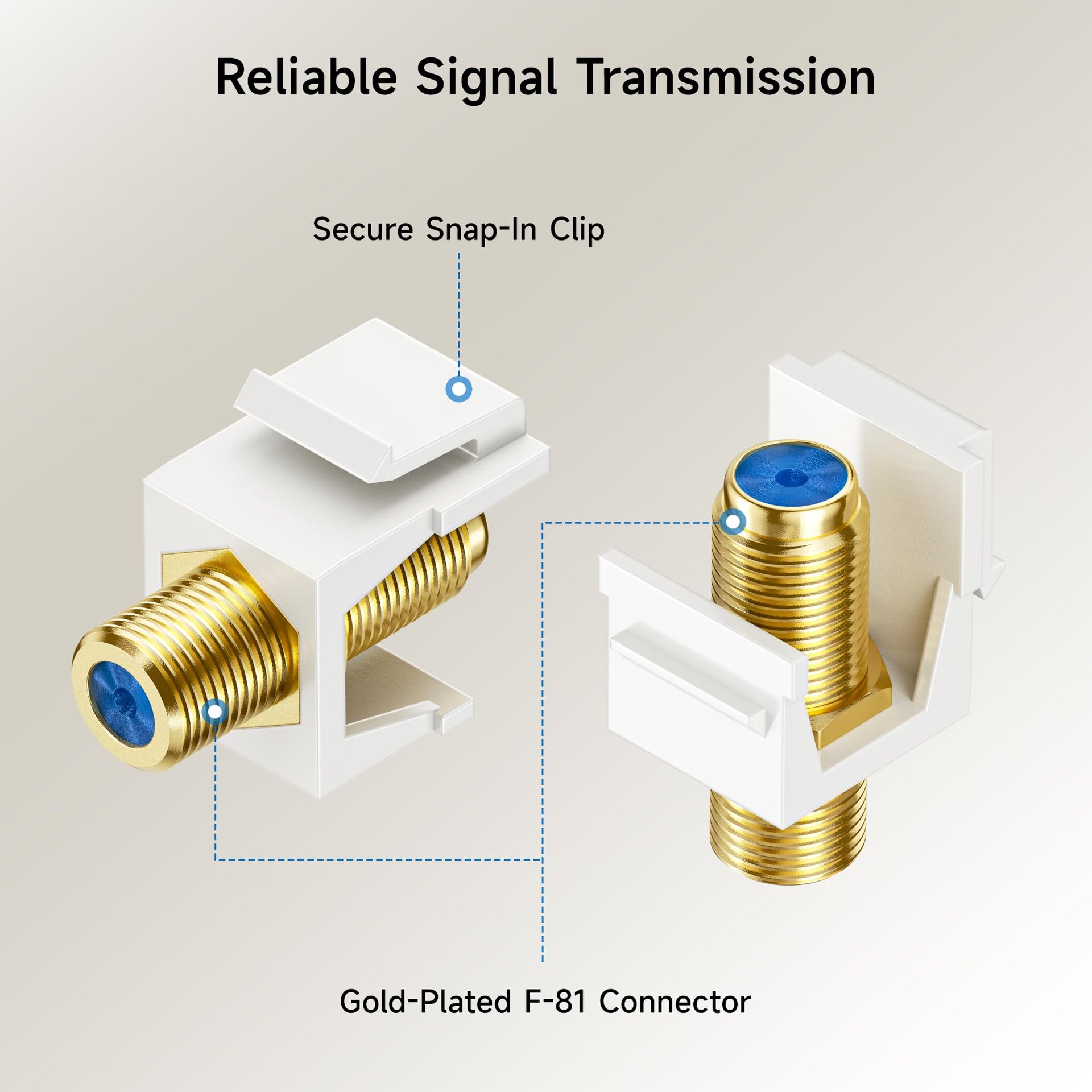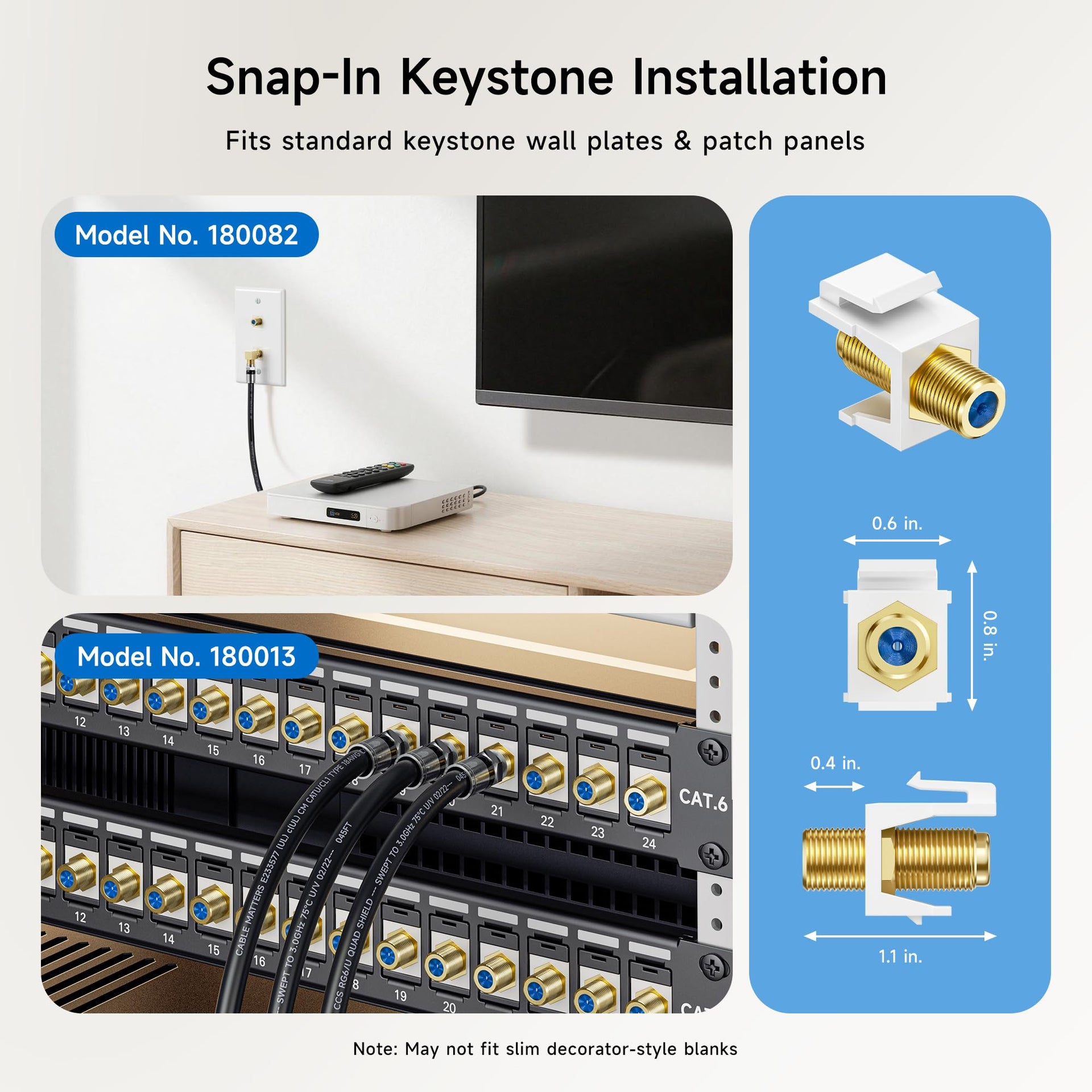 • Coax keystone customized installation in a Cost effective 5 pack of coaxial cable connectors provides a protected and professional termination of RG6 cable with an F-Pin coaxial tip