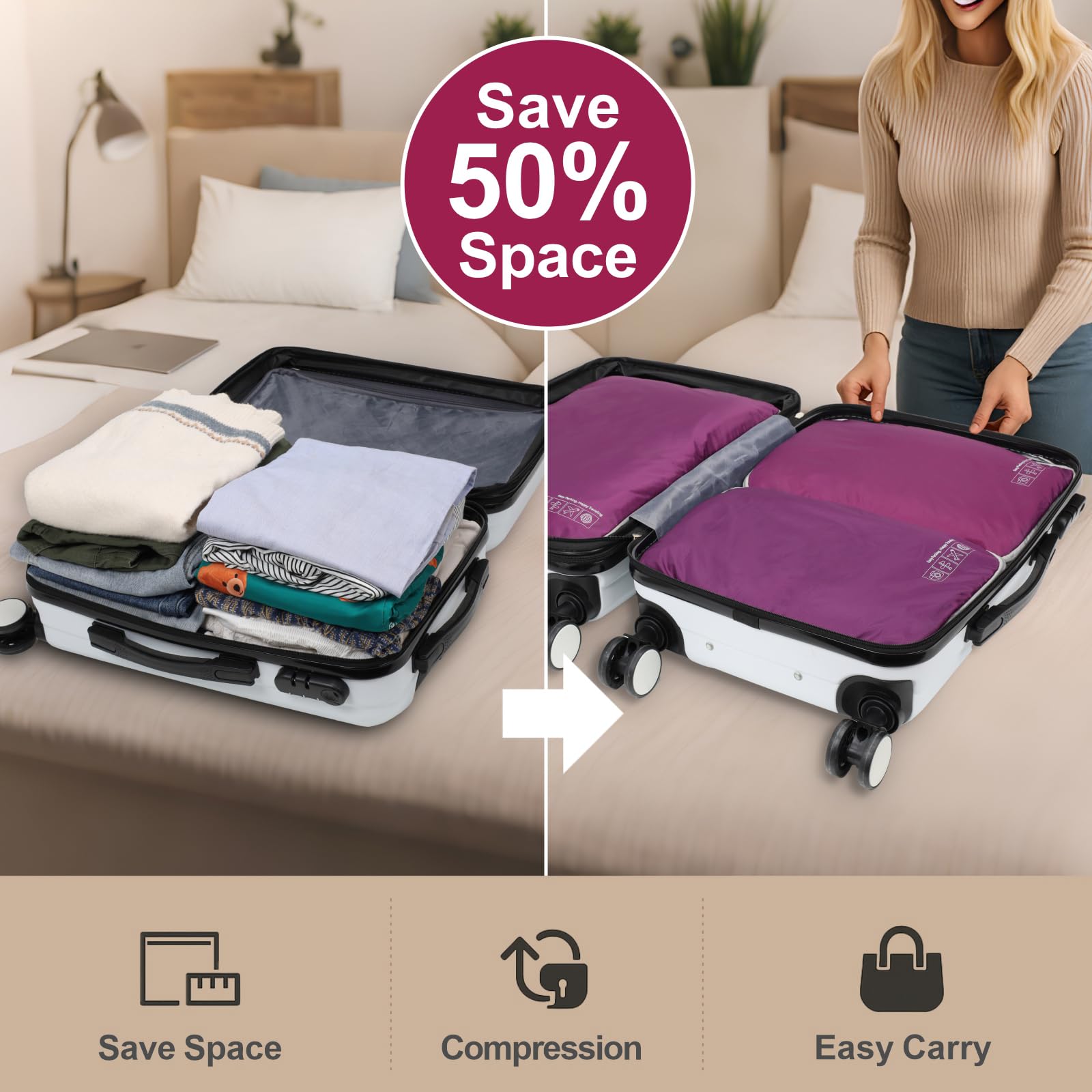 - Pack More in Less Space: Maximize your luggage space with our space saving packing cubes for travel! The compression zipper design helps save up to 50% storage space, allowing you to fit up to 50% more in the suitcase; it can also compress clothing securely to prevent shifting and wrinkles. Perfect for travelers who want to pack efficiently