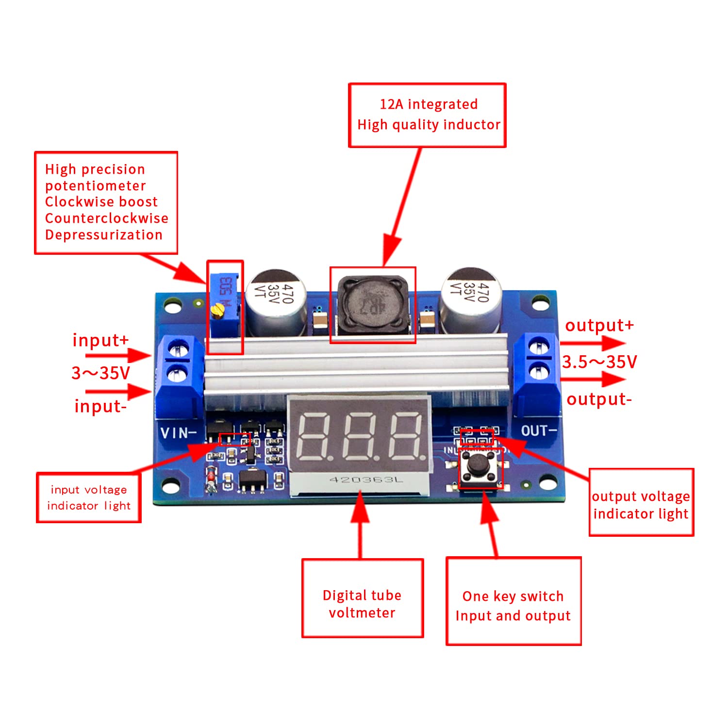 Output voltage range:3.5~35VDC(please to ensure that output voltage above on input voltage)