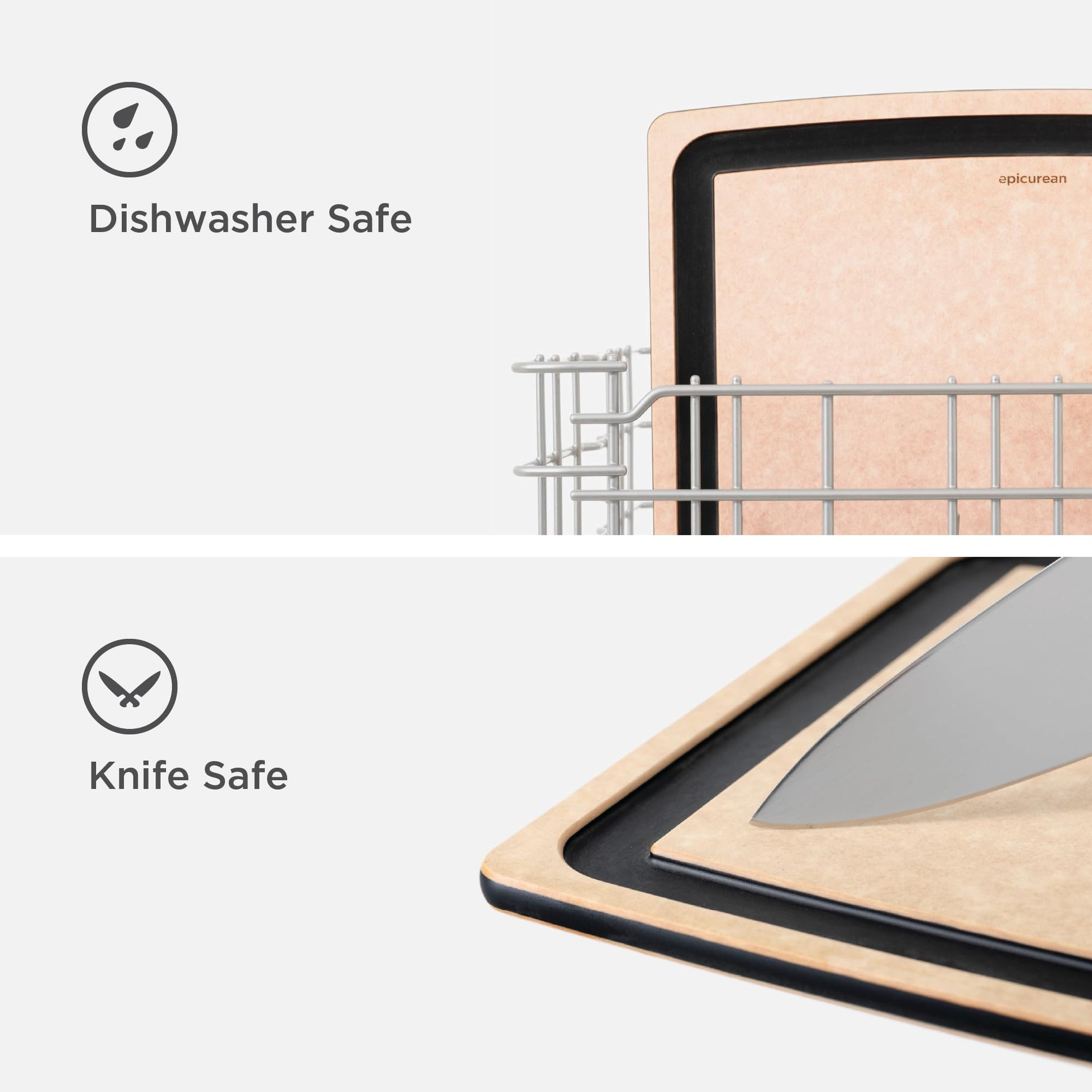 Epicurean cutting boards are a practical and distinctive improvement from poly, glass and wood cutting boards. They have all of the best qualities and none of the bad-in one highly functional surface. Every design is thoughtfully detailed for functionality in use, clean up and storage. All Epicurean cutting boards are designed to fit in the dishwasher. Cutting on Epicurean boards will not dull your knives because the surface will score slightly, which helps it protect your knife's edge. These boards are made with a non-porous wood fiber composite from trees harvested under guidelines of the North America Sustainable Forestry Standards. Epicurean Cutting Surfaces® resist staining and cracking, and are heat resistant up to 350°. Manufactured in the USA, they are dishwasher safe . Reversible, this board is designed with a juice trough on one side and a flat side surface on the other side.