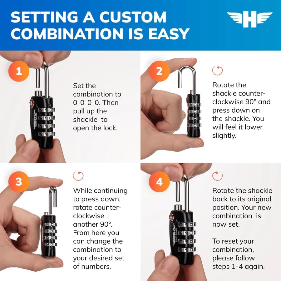 - EASY TO USE AND SET UP – HERO luggage locks feature easy-to-read dials, custom combination settings, and a small and sturdy, premium design perfect for locking up your bags and protecting your things on the go.