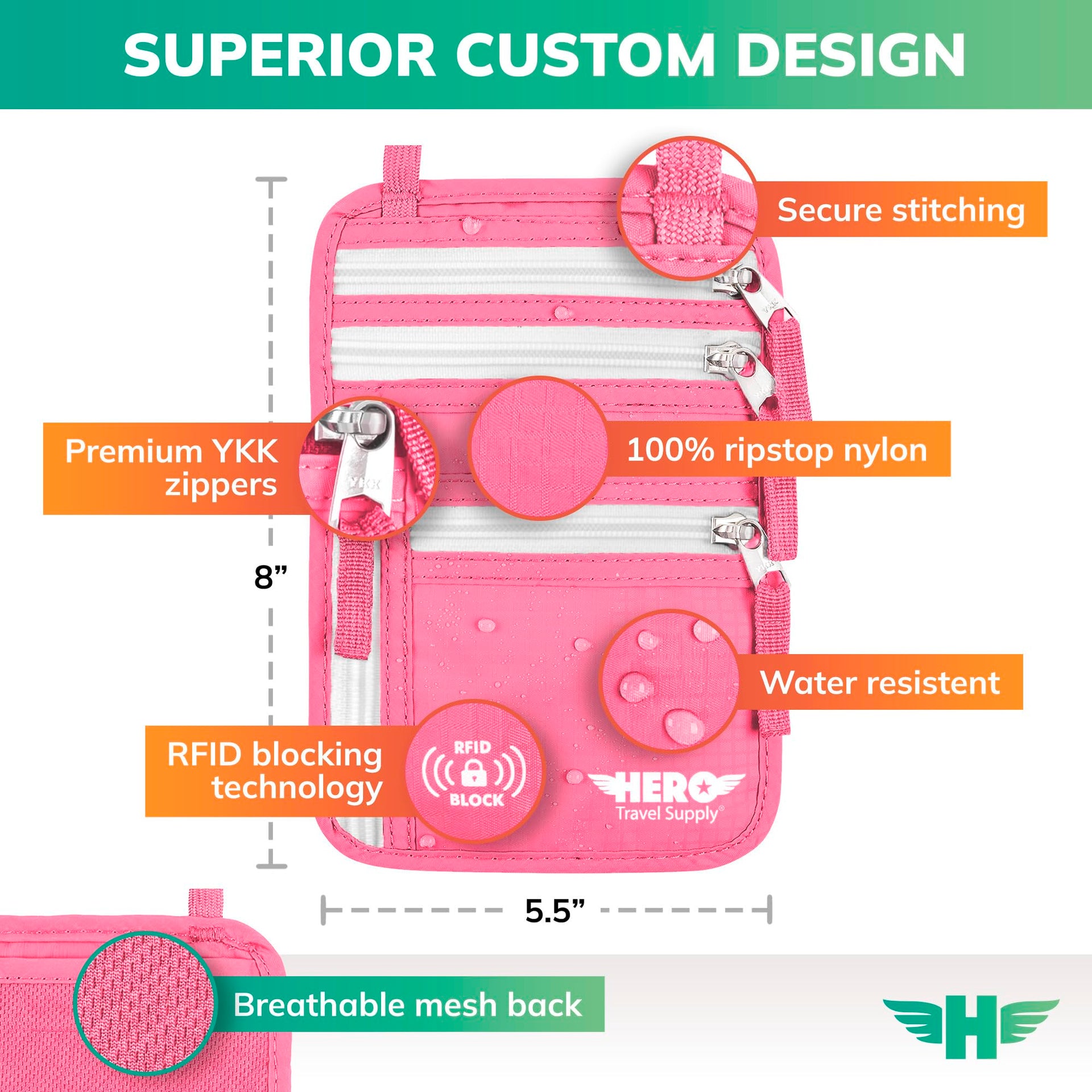 - STREAMLINED ACCESSIBILITY – A stylish, easy-to-use design, that’s comfortable and lightweight. Our HERO Neck Wallet makes it super easy to add or remove items, including passports & large smartphones, for quick travel access.