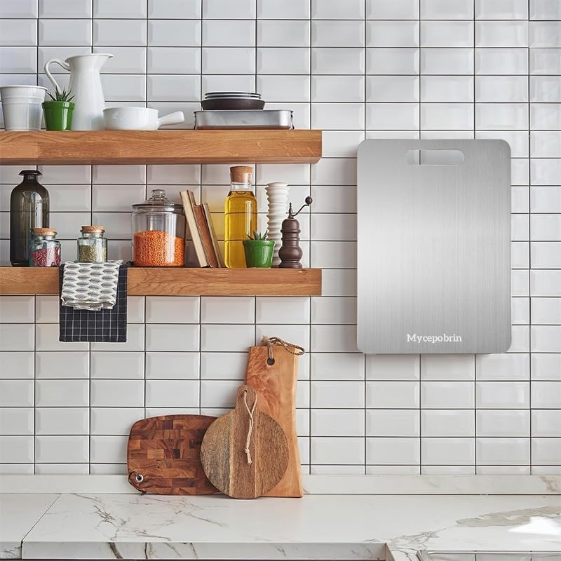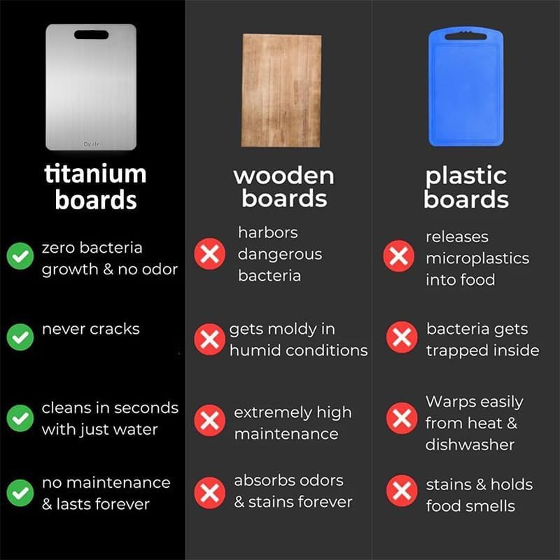 • 【Will not contaminate food】Long term use of wooden cutting boards or plastic cutting board will leave incisions and perforations, which will seep into trace amounts of food residue and produce odors. Titanium cutting boards have no odors or leave food residue