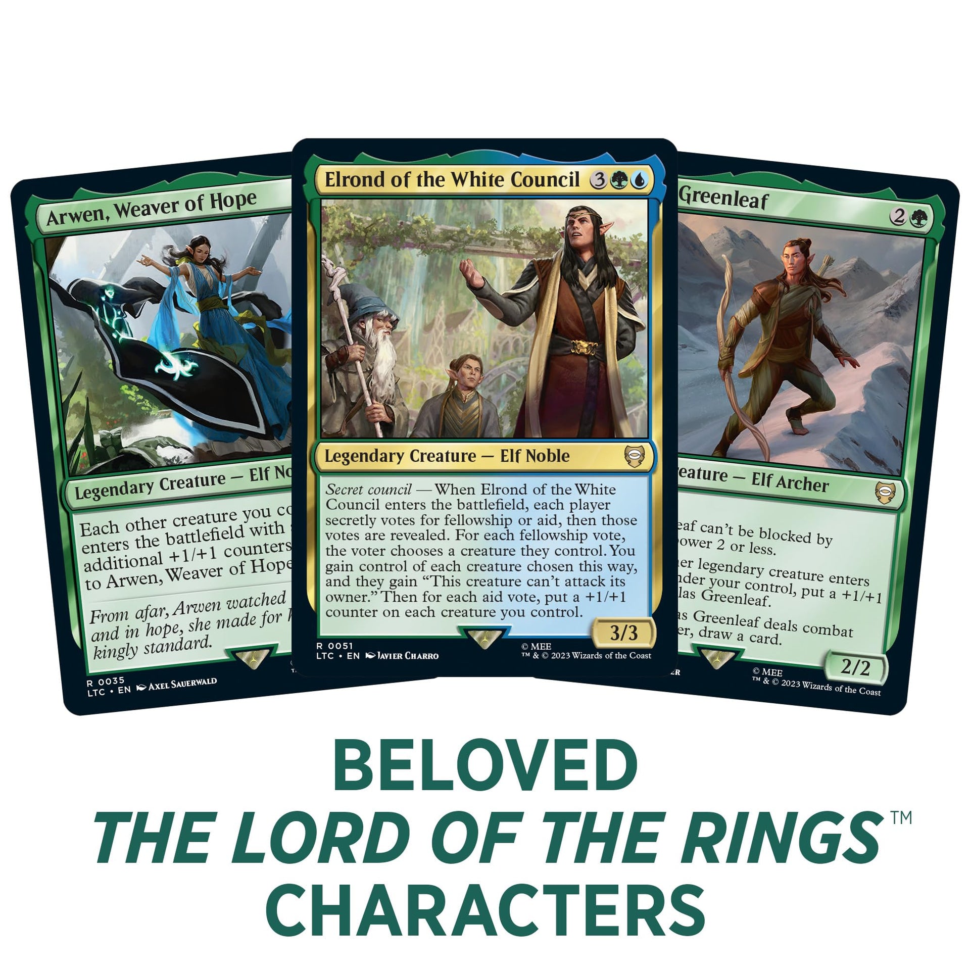The beloved story and characters of The Lord of the Rings meet the thrilling gameplay of Magic: The Gathering in this The Lord of the Rings-themed Commander Deck. Try out Magic’s most popular format with a deck that’s ready to play right out of the box and fight for the fate of Middle-earth. The Lord of the Rings: Tales of Middle-earth Elven Council Commander Deck set includes 1 ready-to-play Green-Blue deck of 100 Magic cards (2 Traditional Foil Legendary Creature cards, 98 nonfoil cards), a 2-card Collector Booster Sample Pack (contains 1 Traditional Foil or nonfoil special treatment card of rarity Rare or higher and 1 Traditional Foil special treatment Common or Uncommon card), 1 foil-etched Display Commander (a thick cardstock copy of the commander card with foil etched into the card’s border and art), 10 double-sided tokens, 1 Helper card, 1 deck box (can hold 100 sleeved cards), 1 Life Wheel, 1 strategy insert, and 1 reference card. This product does not contain Serialized Ring cards, including the Serialized Elven, Dwarven, or Human Sol Ring cards, and the 1 of 1 Ring (Serialized 001 of 001). Serialized Elven, Dwarven, and Human Sol Ring cards can only be found in some The Lord of the Rings: Tales of Middle-earth Collector Boosters. The Serialized 1 of 1 Ring was originally in an English Collector Booster but was found on June 30, 2023. Non-serialized Ring cards are mechanically identical to their Serialized versions.