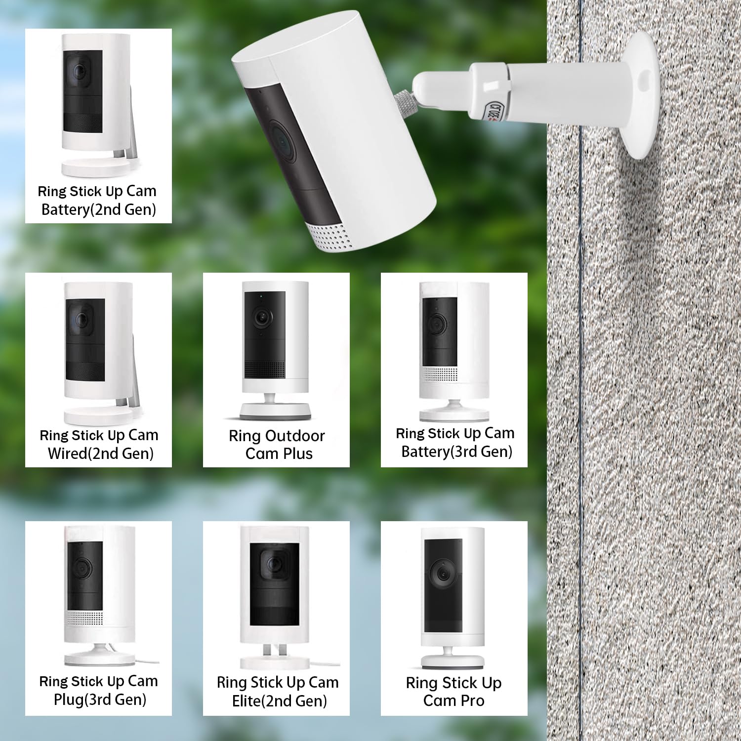 • Universal Bracket?This bracket is a accessories (??NOT Included Camera), Perfectly compatible with Ring Outdoor Cam (Stick Up Cam), Ring Outdoor Cam Plus, Ring Stick Up Cam Pro and Ring Indoor Cam(1st Gen), and compatible with and compatible with Wyze Cam V4/V3/Wyze Cam Pan V3/V2, Eufy SoloCam S220/Eufy Security Indoor Cam E220/EufyCam 2C/2C pro/EufyCam 3/3C, Arlo Pro 5S/Arlo Ultra/Arlo Ultra 2, Google Nest Security Cam and other cameras with standard 1/4 threaded holes.