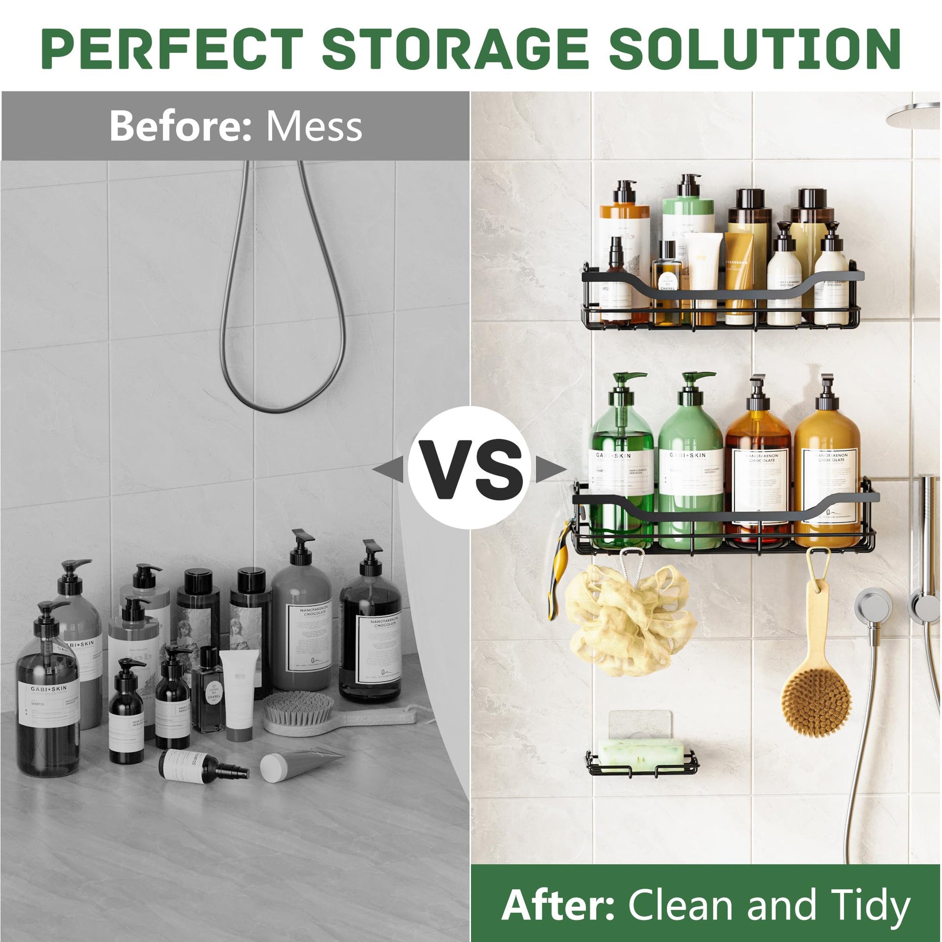 - 3-Pack Shower Caddy Set: It comes with 2 shower shelves and 1 separate soap holder, design with 8 hooks. This shower organizer set can hold various sizes of conditioner bottles, soap, sponges, combs, body scrub, shavers, loofahs, towels