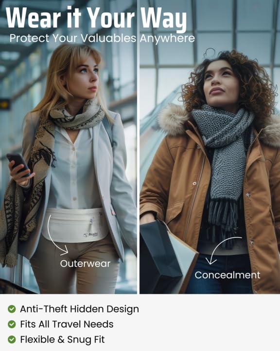 - SPACIOUS & ORGANIZED STORAGE – Keep all your essentials within easy reach! This RFID money belt offers multiple compartments, including two zippered pockets and a hidden rear pocket. Stay organized and secure with this lightweight travel money belt, perfect for storing passports, boarding passes, currency, and even your phone without bulkiness.