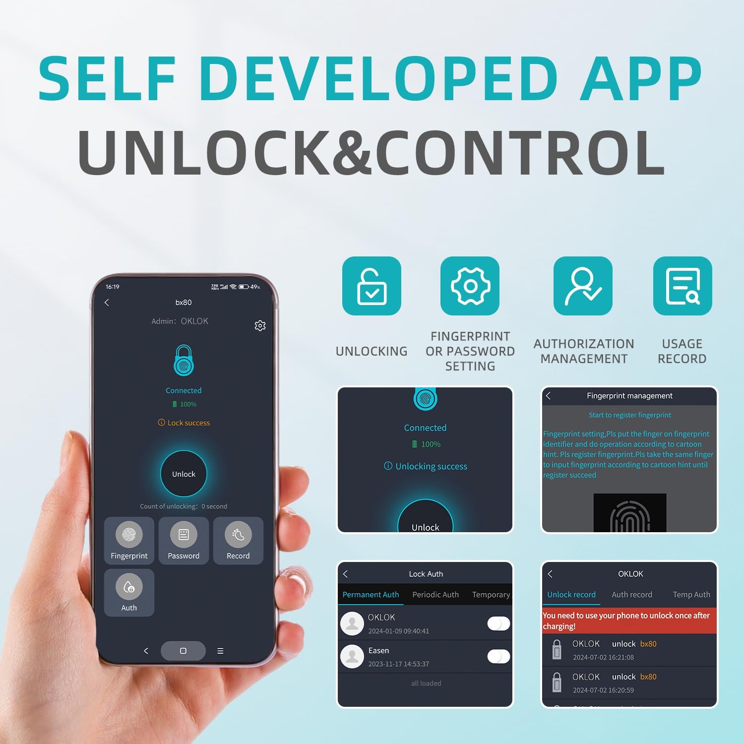 - 【CONVENIENT & EFFICIENT】Connect the smart padlock to the free app via Bluetooth. You can use the app to register fingerprints, unlock, set up authorized users, monitor unlock records, etc., so that the control is in your hands anytime, anywhere.