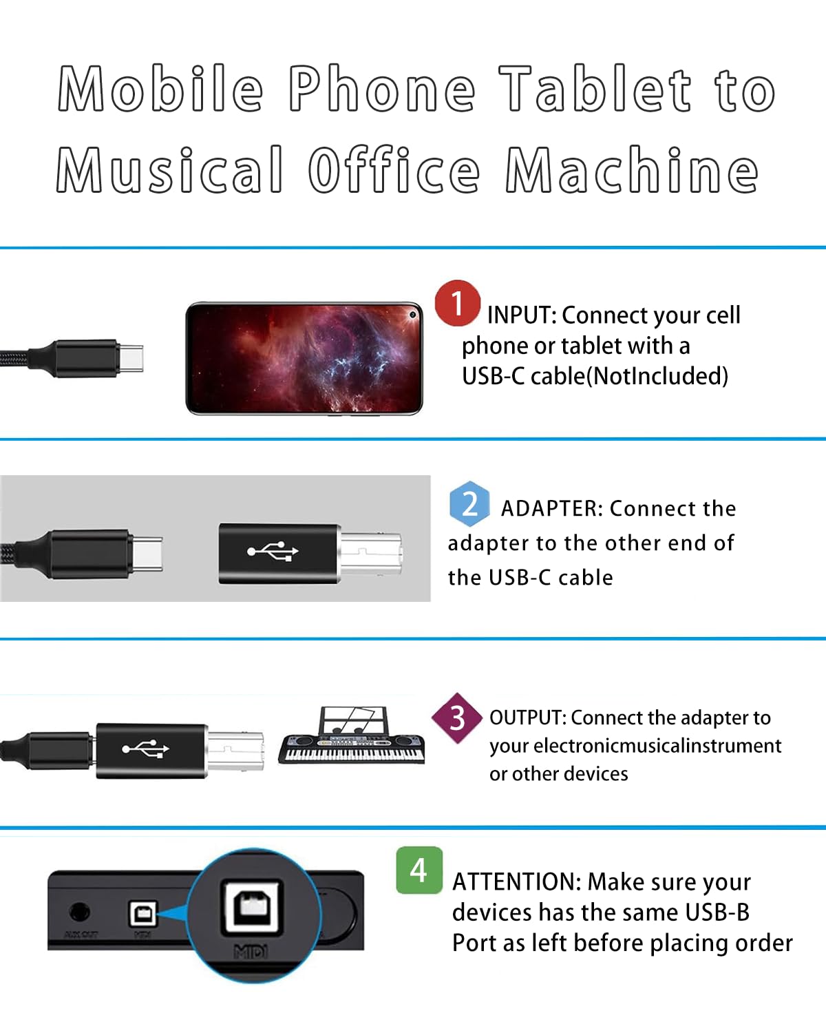 【Name】USB C to USB B Adapter 【Compatible Devices】:Compatible with devices such as Scanner, Printer(Deskjet 2540/3630/2132/2130/3520 etc; Officejet 5740/3831/4658/6600 etc; Envy 4527/4520/4523/5546 etc; Canon i-SENSYS LBP6030w/LBP6200d/MF8280Cw etc; Stylus SX130/SX235w/SX400/SX515w etc; Epson WF-2540/WF-2650/WF-2660/WF-2750 etc), Server,Synthesizer, Camera such as HP, Canon, Lexmark, Epson, Dell, Xerox , Samsung and other(See product detail page for more compatible devices) 【Material】:Aluminum Alloy 【Color】:Black 【Max Output】:5V/3A 15W 【Features】:Data Transfer+Support Charging 【Data Transfer】:480Mbps 【Craft】:Gilding Process 【USB】:USB2.0