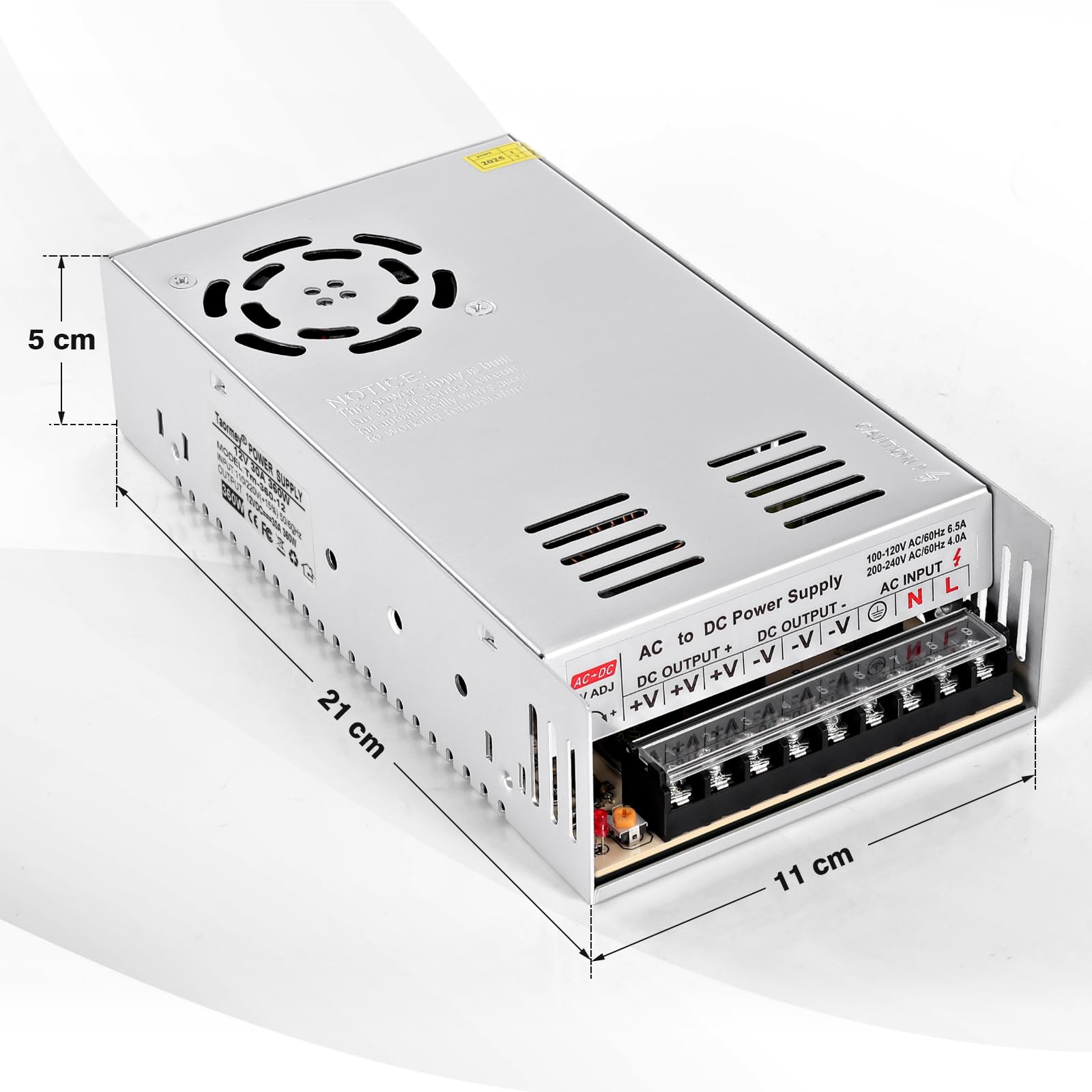 The Taormey 12V 30A Switching Power Supply is engineered to deliver reliable 360W power for both commercial and DIY applications. Featuring a manual voltage switch (110V/220V), it effortlessly adapts to global power standards, making it perfect for international users or multi-regional setups.
