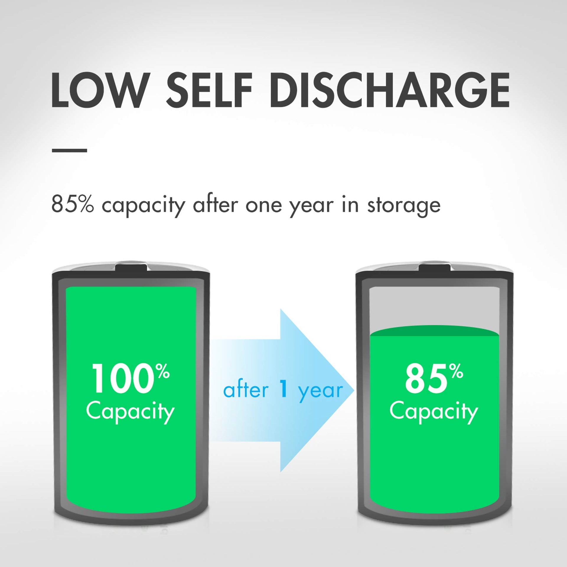 • Tenergy AAA NiMH battery has built in low self discharge technology that prevents it from losing its power after long storage periods. Once charged, it can be stored for 12-24 months with a high capacity percentage left. Centura Low self-discharge AAA battery can retain up to 85% of capacity even if stored for 1 year!