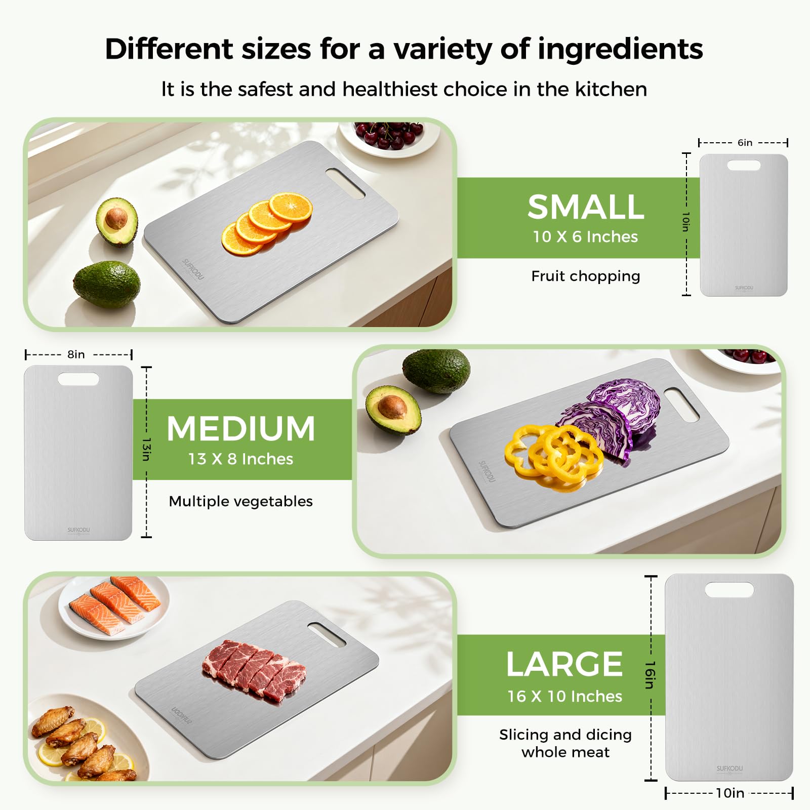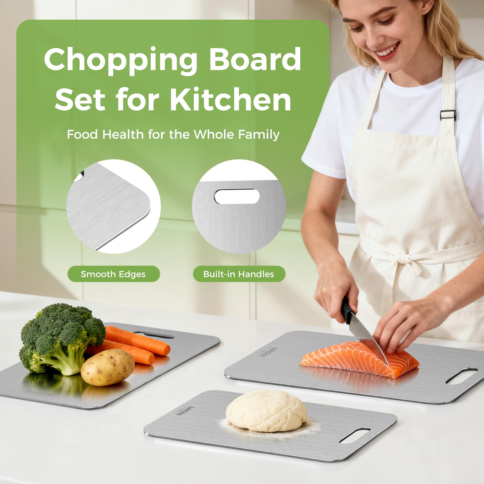 3-Piece Titanium Cutting Board Made of 100% Pure Titanium, Essential Kitchen Item. The Double-Sided Design Separates Raw and Cooked Food Areas. Non-toxic, Harmless,Dishwasher Safe, Easy to Clean. A Must-Have for Any Home Kitchen