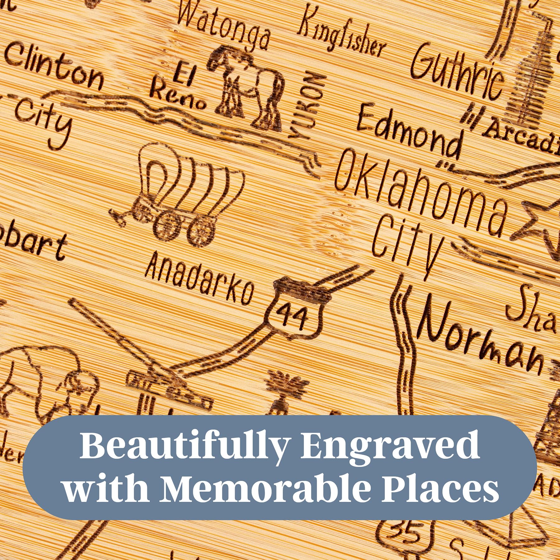 • Celebrate The Sooner State - Show your Oklahoma pride with this beautifully crafted state-shaped cutting board featuring detailed laser-engraved map artwork of cities, towns, landmarks and beloved sights
