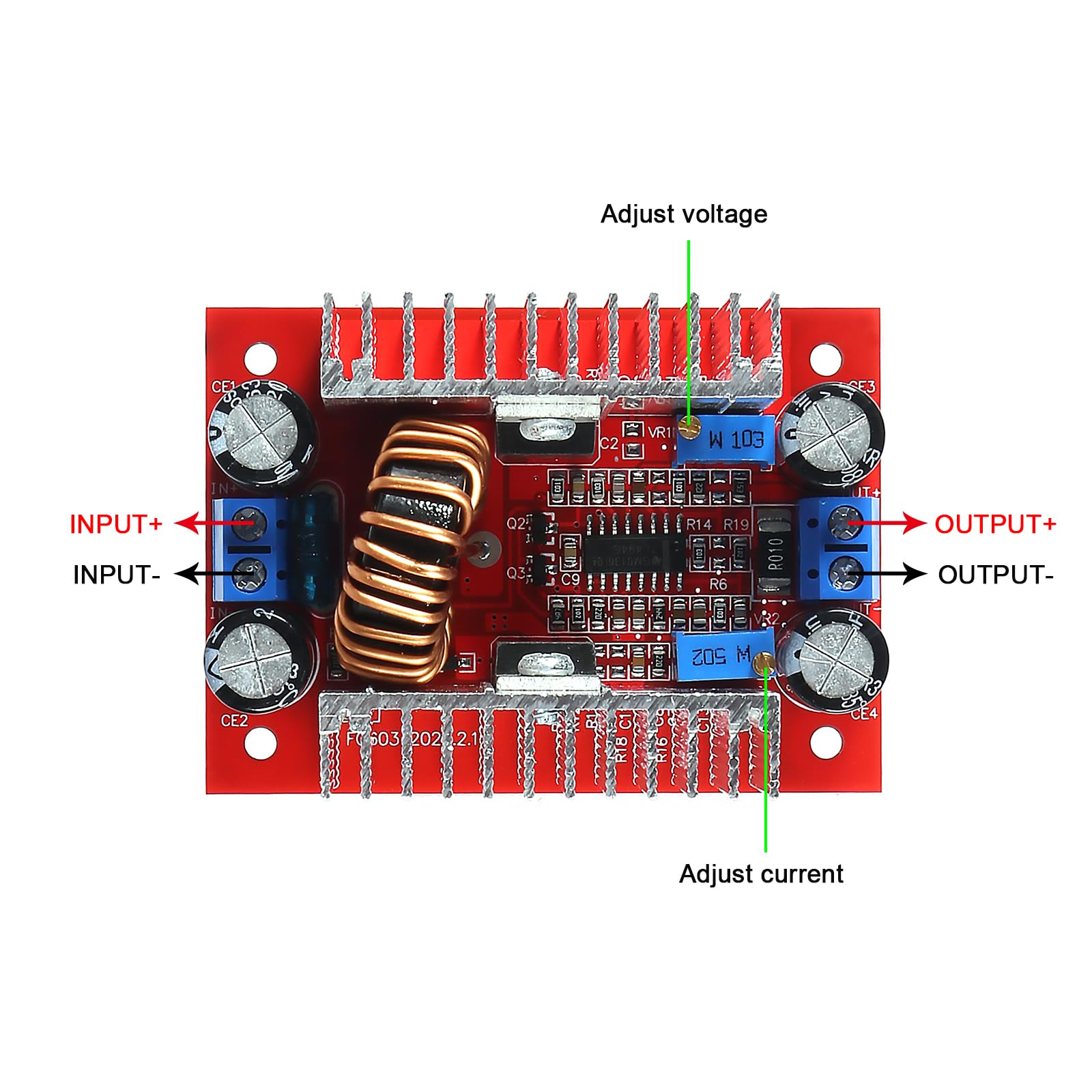 • ★The boost module has 2 heat sink that could enhance heat dissipation. When there is a big difference between input and output voltage, please decrease power and current.